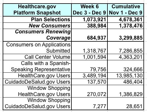 For comparison, a total of 950,000 NEW enrollees were added from 12/11 - 12/19 last year, plus another 450,000 or so from 12/20 - 1/31, for a total of around 1.4 million new enrollees added from 12/11 - end of open enrollment on the federal exchange last year. Matching that in just the current week would make the grand total around 8.7 million, or 500K lower than last year. This would still be 1.2 million higher than my "official" HC.gov projection of 7.5 million, however.