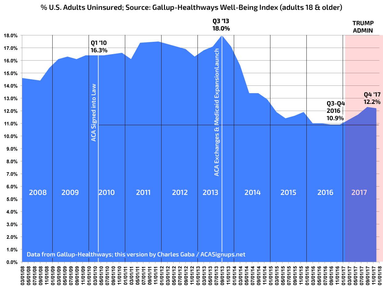 - The U.S. uninsured rate among adults, which had reached 18% just before the major Affordable Care Act provisions (individual market exchanges and Medicaid expansion) kicked into effect, reached an all-time low of 10.9% last winter...