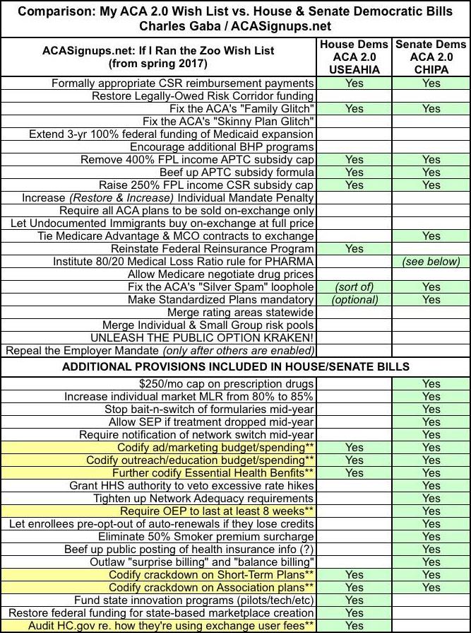 There's been some more developments since then. First of all, the Senate Democrats came out with their own "ACA 2.0" bill (officially called the "Consumer Health Insurance Protection Act" or "CHIPA"), which overlaps about 80% with the House version and actually includes more items on my wish list, so I'll slightly modify my recommendation above (I'd actually prefer a merged version of the two).