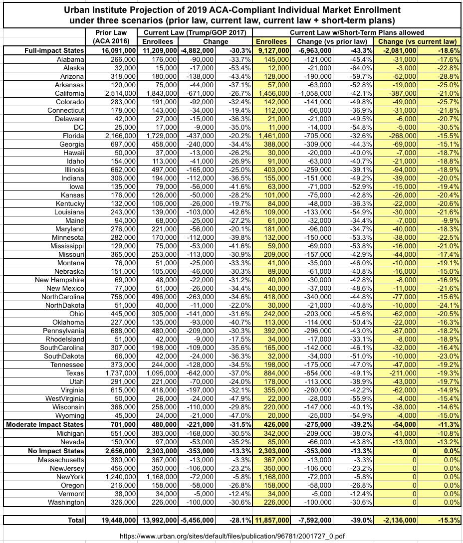 Under the Short-Term Plan scenario, they foresee subsidized enrollment dropping by over 600,000 more people and unsubsidized dropping by 1.5 million, along with small additional drops in emloyer and Medicaid coverage, for a net increase in the uninsured of around 2.5 million more people next year on top of the 6.4 million which they believe current Trump/GOP sabotage efforts will have caused by 2019.