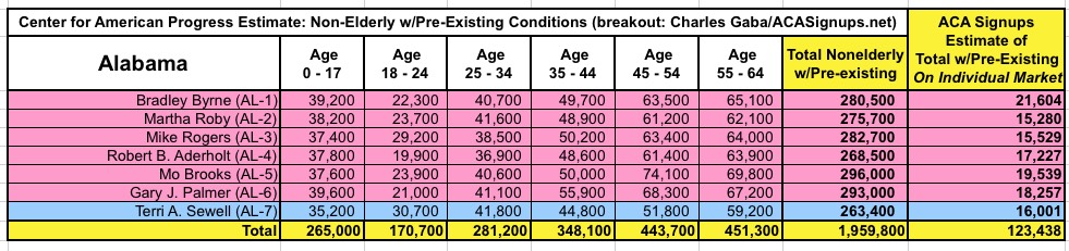 For instance, CAP estimates that in Alabama's 1st District, around 280,500 non-elderly residents have pre-existing conditions. There's around 590,000 non-elderly people living in AL-01, so that's roughly 47.5% of the total.