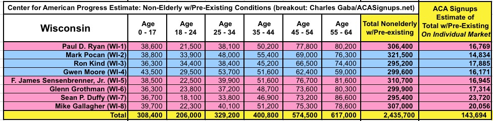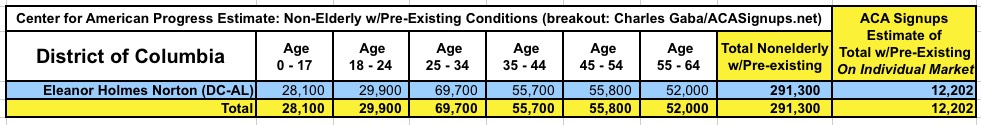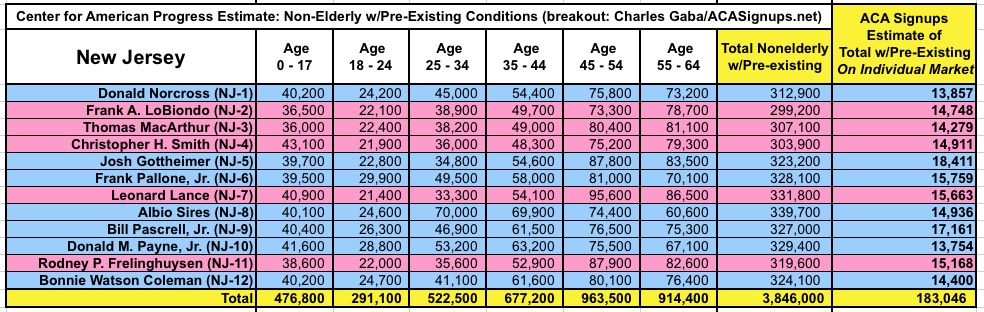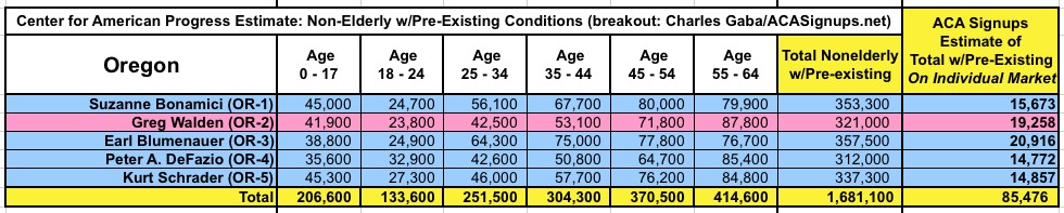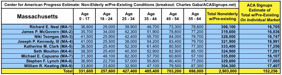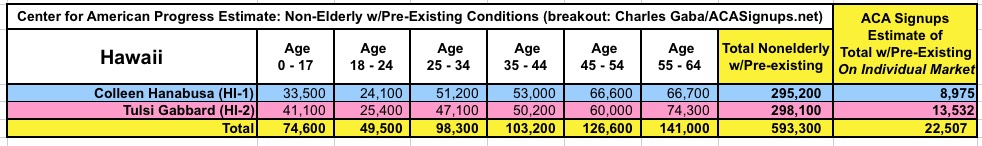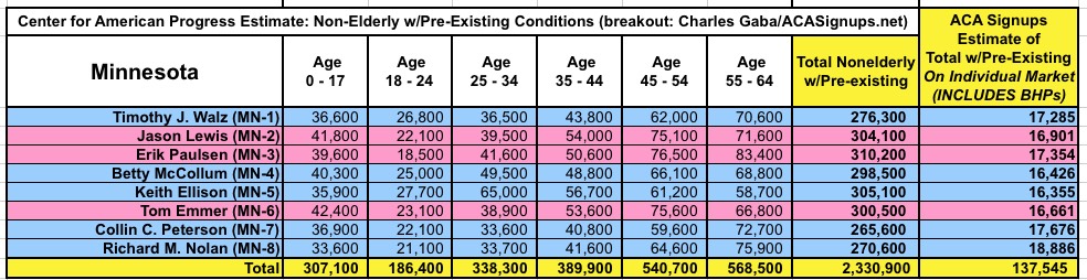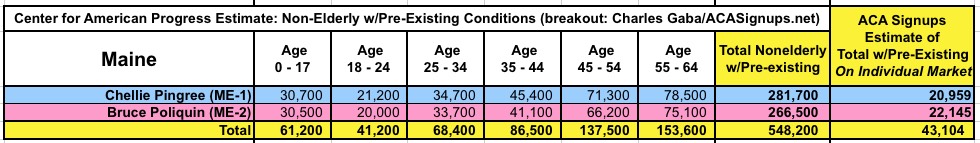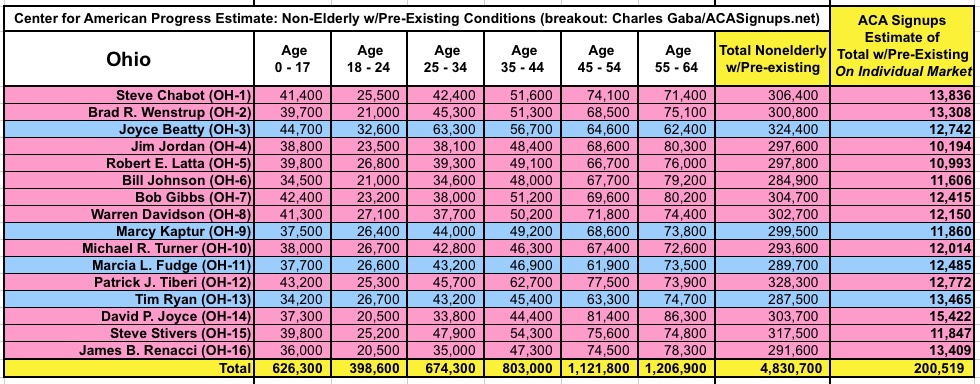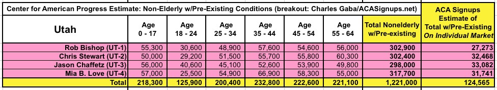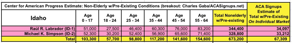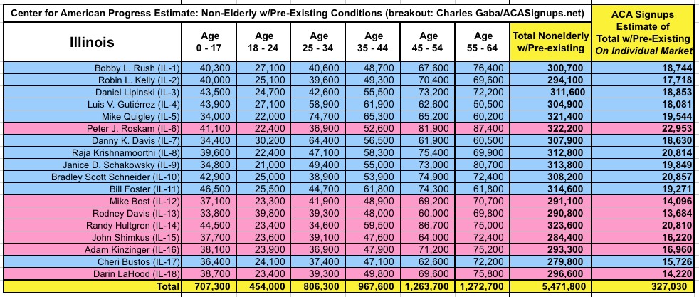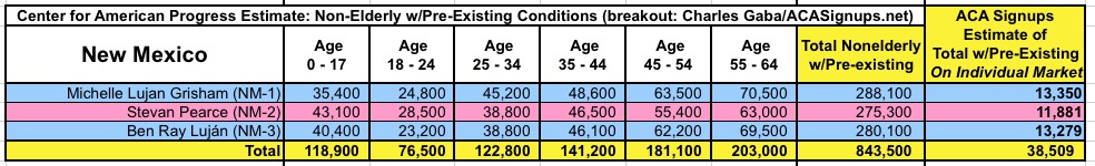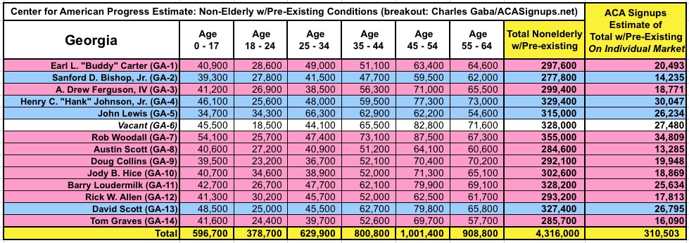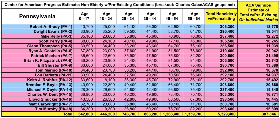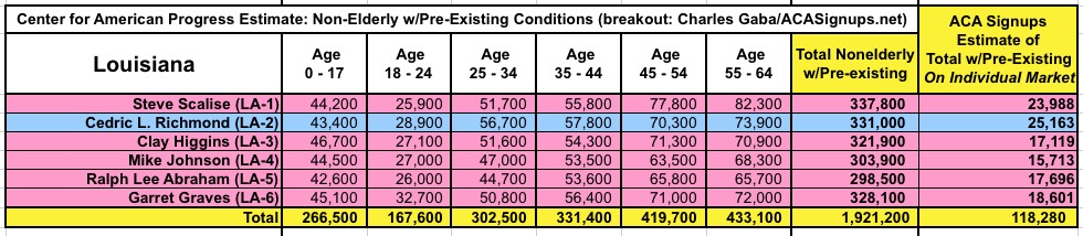 The CAP spreadsheet is extremely handy, and they deserve full credit for crunching the numbers. Unfortunately, it's only available as a single massive spreadsheet, so I've takent the liberty of grouping all 435 CDs together by state into shareable JPG images. I'm also color-coding each CD by party control and, while I'm at it, I'm also plugging in my own estimate of how many people currently on the individual market likely have some sort of pre-existing condition which would likely result in them being charged dramatically higher rates to the point that they likely couldn't afford coverage whatsoever if the Trumpcare 2.0 bill were passed. These estimates are obviously much lower than the total nonelderly population, and are based on: