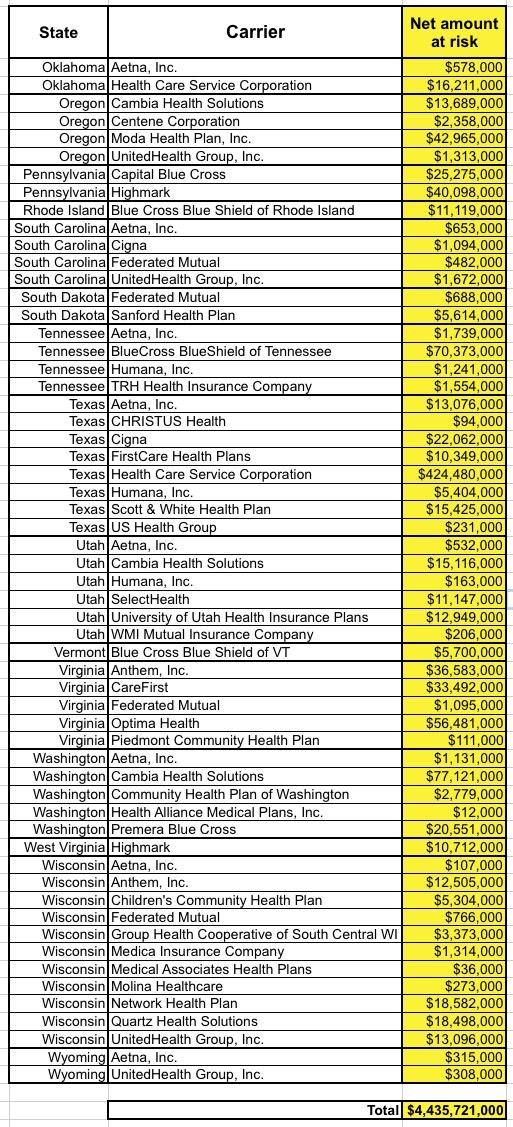 There's a lot of examples of this. And yes, I went ahead and went thorugh all 610 carrier listings and combined the various multiple entries for the same carrier to get this: A full listing of the net 2017 funds which carriers are at risk of losing (or at least of being frozen for awhile). I didn't bother with the other side of the coin, since those carriers aren't any worse off than they otherwise would be (at least in theory). All told, out of 610 listings, 184 carriers are actually owed money (fewer, really, if you only count national carriers once...Aetna, Inc. has listings in 25 states even after you combine the in-state divisions, for instance.