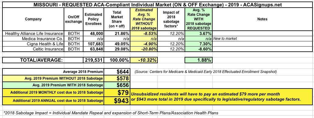 Average ACA-compliant premiums are around $644/month in Missouri this year, so that means an effective $79/month sabotage tax, or $943 per enrollee.