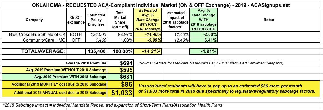 Unsubsidized Oklahoma enrollees are paying an average of $694/month in 2018. Without ACA sabotage, they'd likely see this drop to around $595; instead, they're likely looking at paying roughly $681/month, or an additional $1,033 apiece.