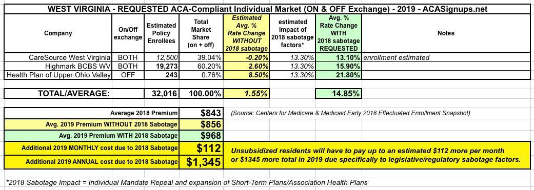 West Virginia: Preliminary 2019 #ACA rate hikes: 14.9%; would have been closer to 2% without #ACASabotage