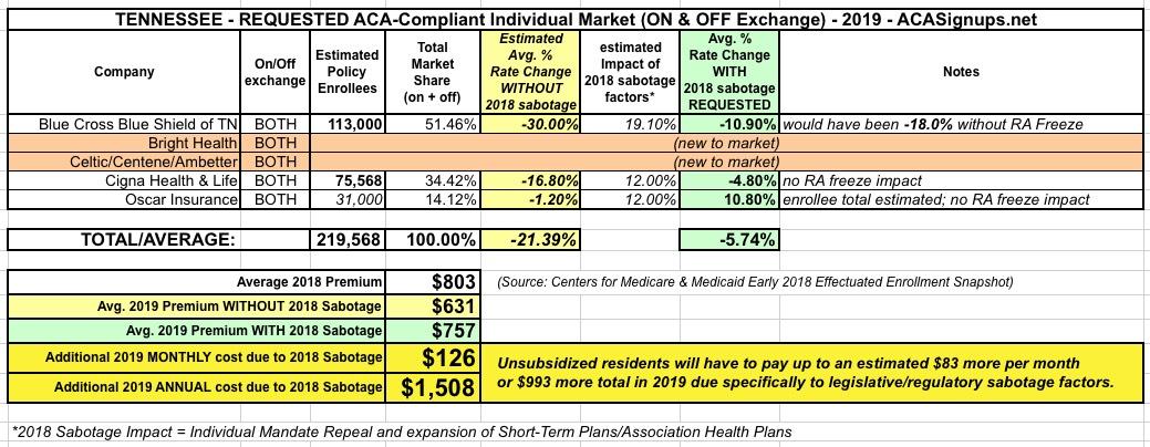 UPDATE 8/22/18: The Tennessee Insurance Dept. has announced their approved 2019 rates for ACA policies, and while the final numbers are slightly different from above, they're pretty close. BCBSTN ended up with a 14.8% drop instead of 14.9%, while Oscar's weighted average increase appears to be around 9.0% instead of 7.0%: