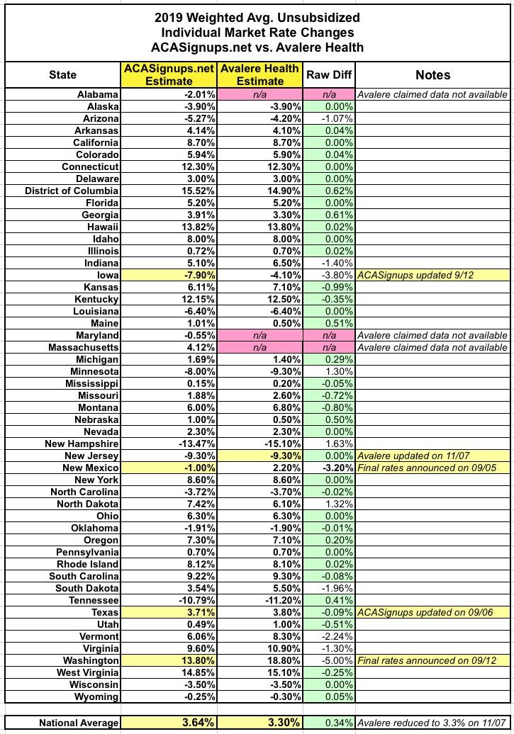 As you can see, they're either identical or off by less than 1 percentage point in 37 states...and Avalere didn't even run an analysis in three others, for reasons unknown (at least partial data for Alabama, Maryland and Massachusetts has been available for over a month, so I'm not sure what their rationale was).
