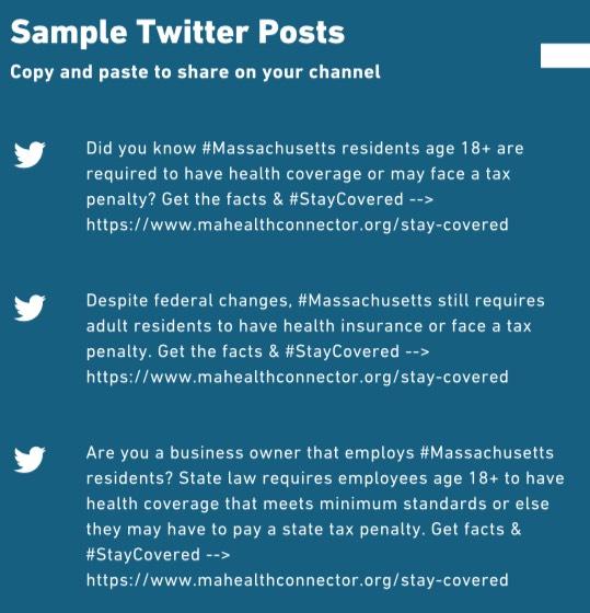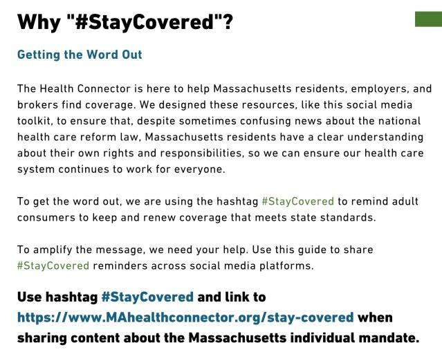 While I'm not sure how extensive the measures being taken in New Jersey or DC are, it appears that Massachusetts is indeed doing all they can to get the word out to Bay Staters. This is from a toolkit brochure which is part of a robust education/outreach push by the MA Health Connector, with the hashtag #StayCovered. It's pretty self-explanatory: