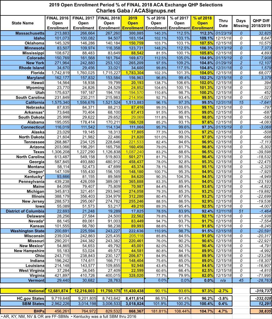 I still expect the final national QHP selection tally to increase by around 35,000 more when the dust settles, including perhaps 1,000 more from DC, 5K - 10K more from New York and around 28,000 from Vermont (which hasn't reported anything so far this Open Enrollment Period). If so, the official total should end up around 11.47 million nationally, with the 12 State-Based exchanges coming in around 1.6% higher than last year (an all-time high for them collectively) vs. the 39 states on the federal exchange, which dropped another 3.8% this year. Nationally, the official total should end up around 280,000 enrollees short of last year.