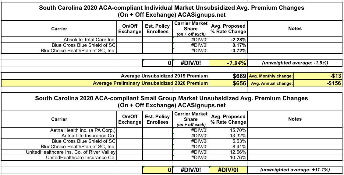 (sigh) I'm into the home stretch with only a handful of states left to go. Unfortunately, South Carolina is yet another state where the actual enrollment numbers are either missing or redacted, making it impossible to run a properly weighted average...but again, the range between the three carriers offering individual market policies is so narrow that it doesn't make much difference anyway (between -3.72% and +0.17%).