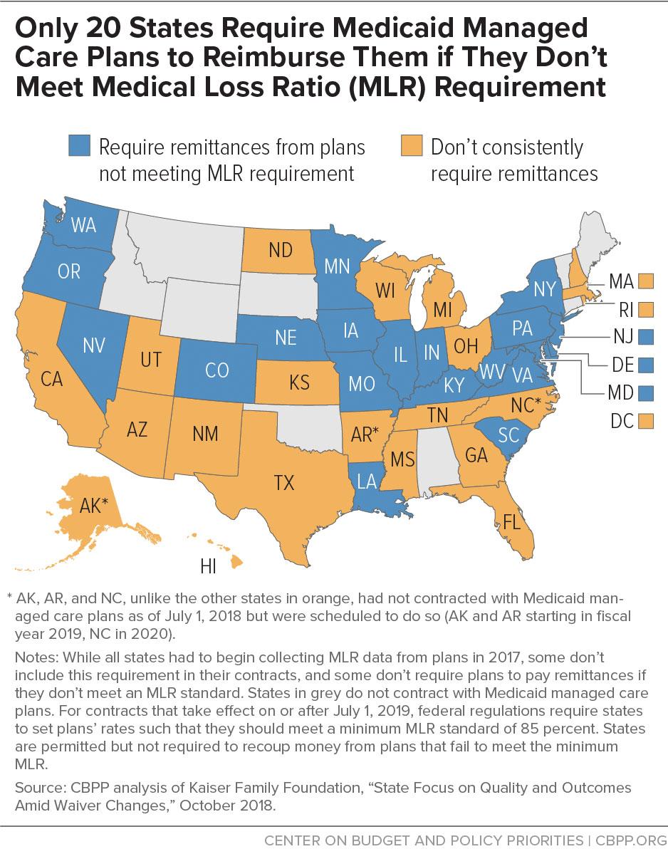 Federal regulations finalized in 2016 require Medicaid managed care plans to calculate and report their MLR to the state annually for contracts that take effect on or after July 1, 2017. An MLR requirement encourages plans to keep their administrative costs low and gives states important information to help them set appropriate rates for the plans. Yet many states do not include MLR reporting requirements in their Medicaid contracts with managed care organizations; the federal government has not released information about states’ compliance.