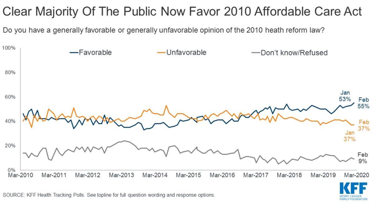 - The U.S. Supreme Court will decide today whether to take up Texas v. United States, which challenges the constitutionality of the 2010 Affordable Care Act (ACA). The February KFF Health Tracking Poll finds attitudes towards the ACA has hit its highest favorability since KFF began tracking opinions nearly ten years ago. The latest KFF poll finds a clear majority of the public viewing the law favorably (55%), while slightly more than one-third (37%) of the public hold unfavorable views.