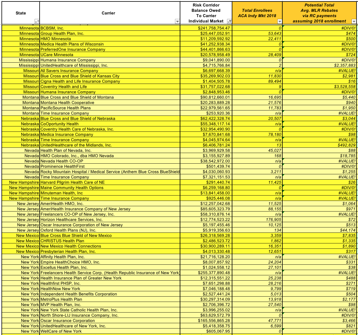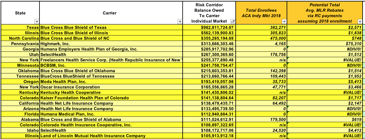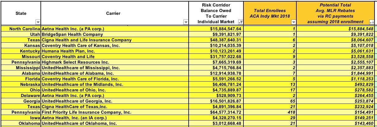 (At the opposite end of the spectrum, as I mentioned earlier, is CareFirst BlueChoice of DC, which is only owed $15,000...and they had 4,400 enrollees in 2018, which means that assuming a similar enrollment this year, each one would likely only receive $3....spread out over 3 years. Enjoy that $1/year, folks!)