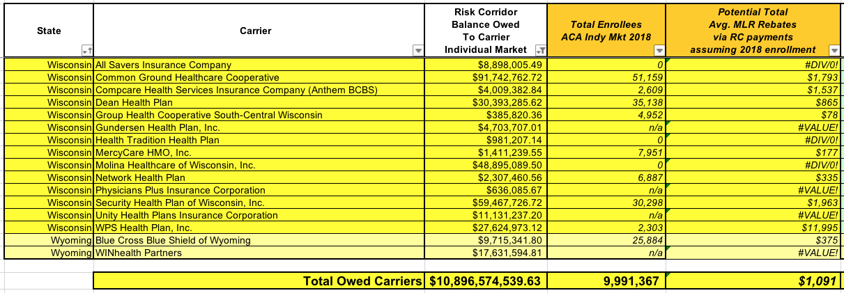 • Fifth: Some of the carriers which are owed RC payments don't exist any longer! Over a dozen non-profit co-ops went belly up in late 2015 (many in large part due to them being stiffed by the feds, I should note!), as did a few other small private carriers, such as WIN Health out of Wyoming. Any money owed to them will instead presumably go to their creditors or whatever hedge fund bought out their debt or whatever. Others may have since been bought out or merged with a larger carrier...which could mean the RC payments go to them instead (and could still potentially have to be paid out as MLR rebates, just by a different insurance company).