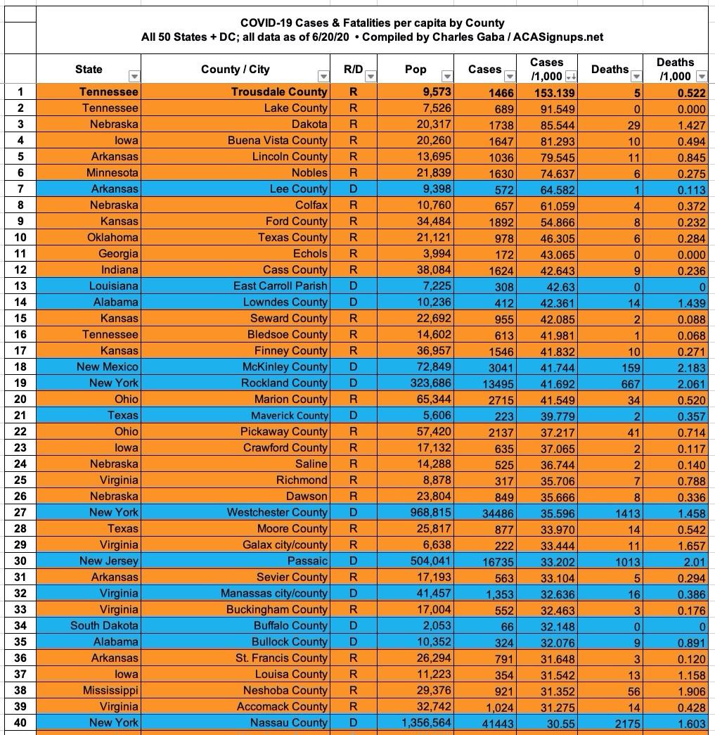 Here's the top 40 counties ranked by per capita COVID-19 cases as of Saturday, June 20th: