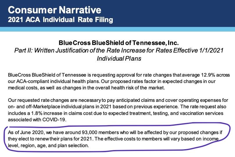 UPDATE 7/31: OK, this is very strange...I found the "Consumer Narrative" from BCBSTN, and sure enough, it only pegs their total individual market enrollment as of June 2020 as 93,000 people! This would make Tennessee's total Indy market just 190,000, which is a lot closer to what I have it pegged at (Mark Farrah Associates just pegged it at around 221,000, and that includes some number of short-term plans).