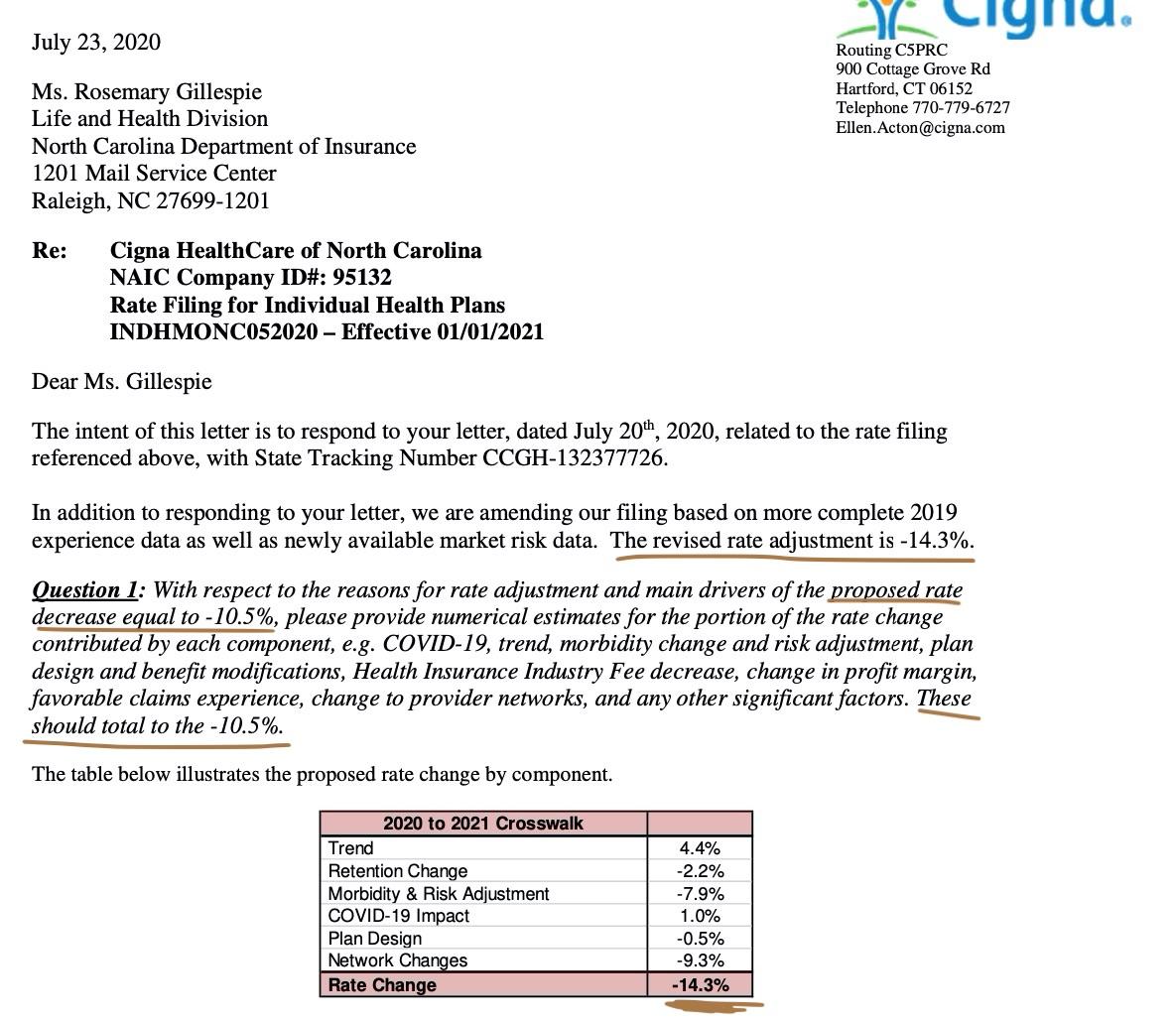 UPDATE: (sigh) Louise Norris called attention to what appears to be an important typo in the NC DOI PDF above...this objection letter/response buried in the SERFF database certainly makes it look like Cigna is actually requesting a 10.5% reduction in their 2021 premiums, not a 10.5% increase. Adding to the confusion, the response to the letter makes it look like they're actually asking to drop rates 14.3%...