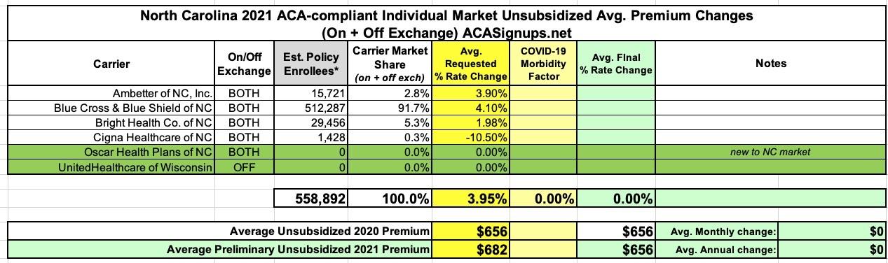 North Carolina: Preliminary avg. 2021 #ACA premiums: +4.0% indy market, +6.8% sm. group