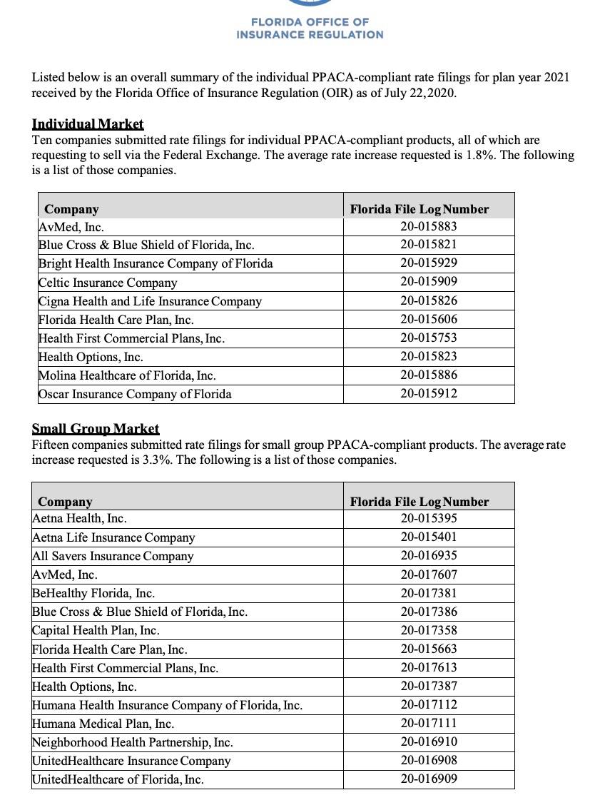 Florida: Preliminary avg. 2021 #ACA premiums: +1.8% individual market; +3.3% sm. group