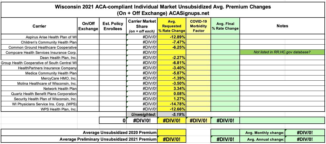 Case in point, Wisconsin: I have the average requested 2021 premium rate filings for every carrier on the individual and small group markets...but the actuarial memos are all redacted and none of the URRTs are available at all, making it impossible for me to run a weighted average since I don't know how many enrollees each carrier has. Also, for the second year running, Compcare Health Services doesn't appear in CMS's Rate Review database at all for reasons unknown.