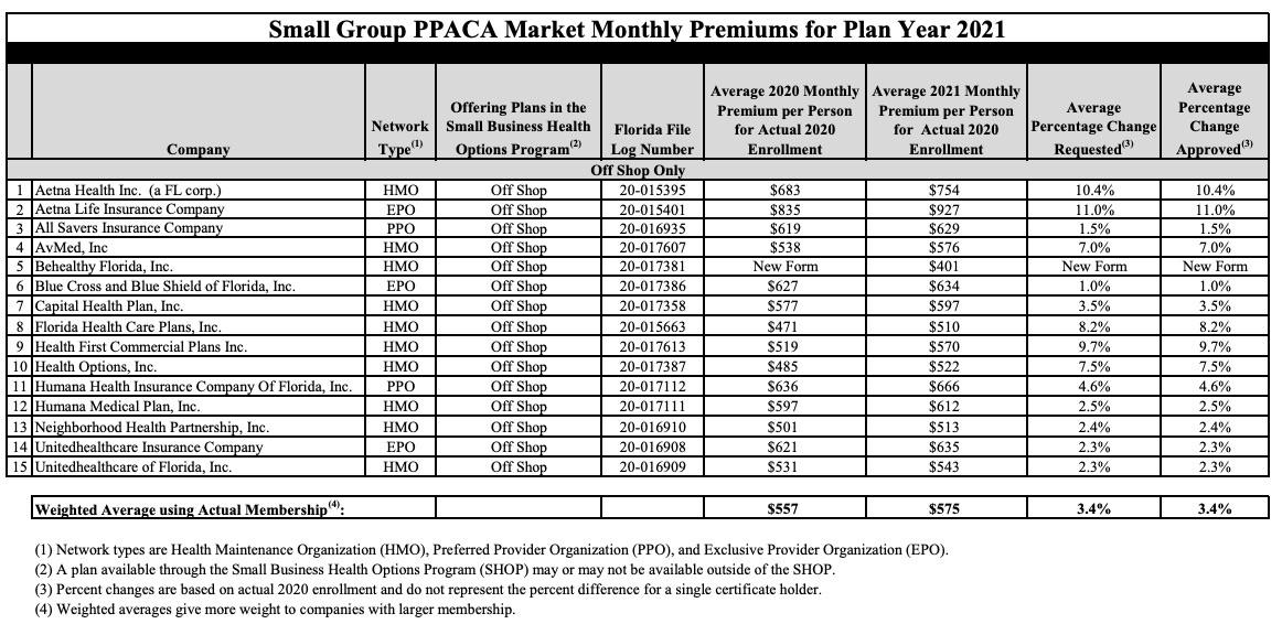 Florida: *Approved* avg. 2021 #ACA premiums: +3.1% individual market; +3.4% sm. group