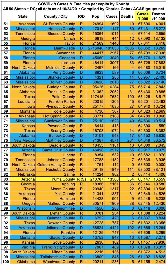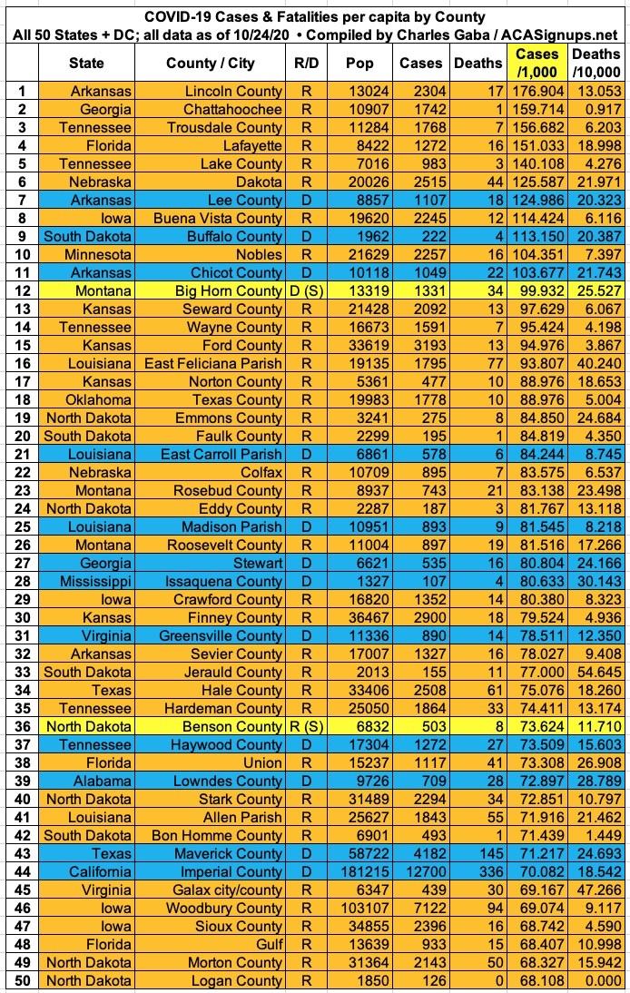 Here's the top 100 counties ranked by per capita COVID-19 fatalities as of Saturday, October 24th (click image for high-res version):