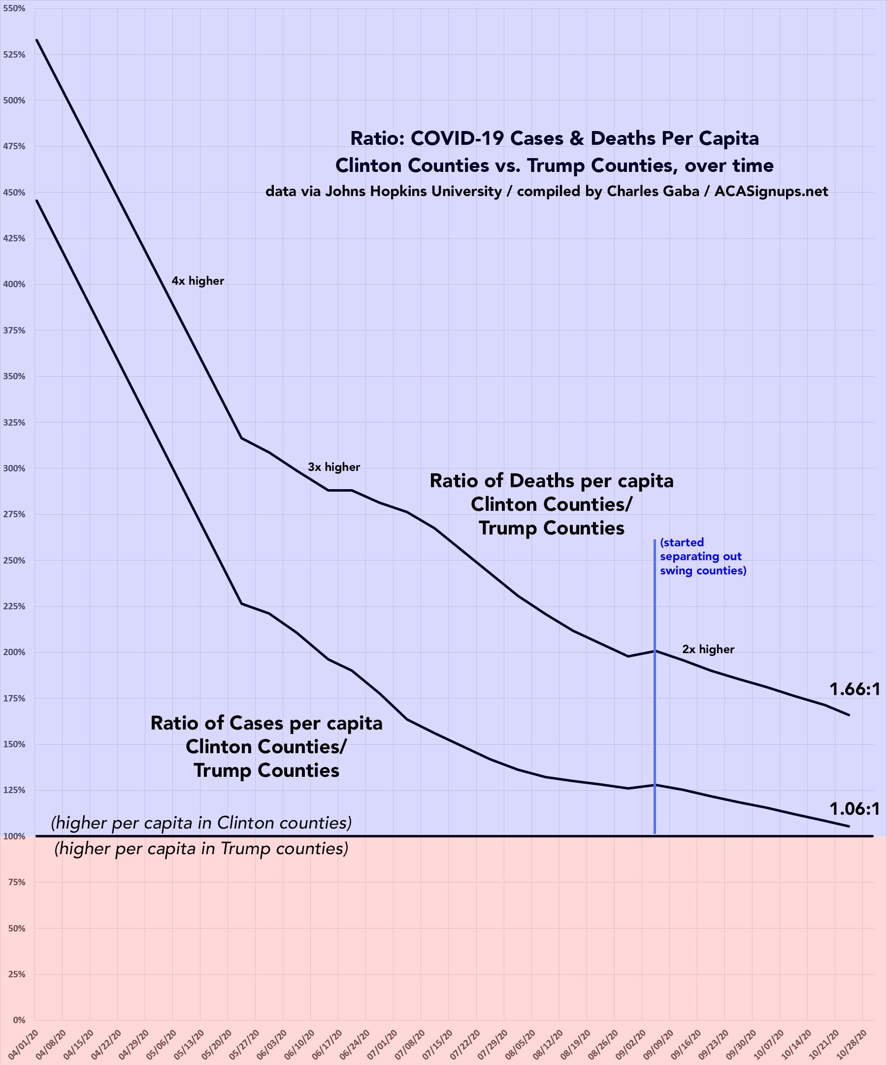 As you can see below, separating out the ~200 swing counties from the Red and Blue ones caused the ratio between the two for both case rates and death rates to bump back up towards a higher blue county rate, but only slightly and only for that one week. The trend has continued downwards since then: