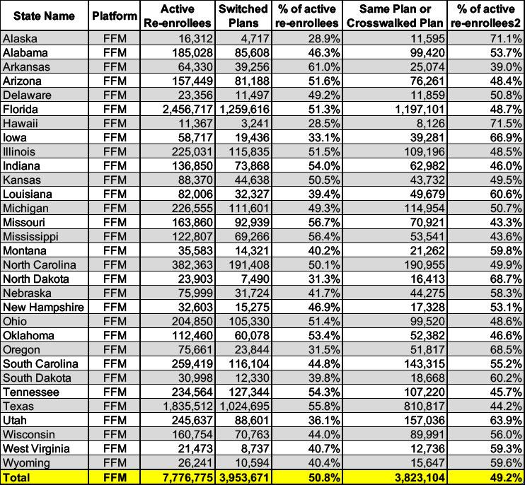 It's also worth noting that for the 31 FFM states only (data not available for the SBM states), around half of those who actively re-enrolled switched to a different plan, while the other half remained in their existing plan or actively chose the crosswalked plan if their current plan was no longer available.