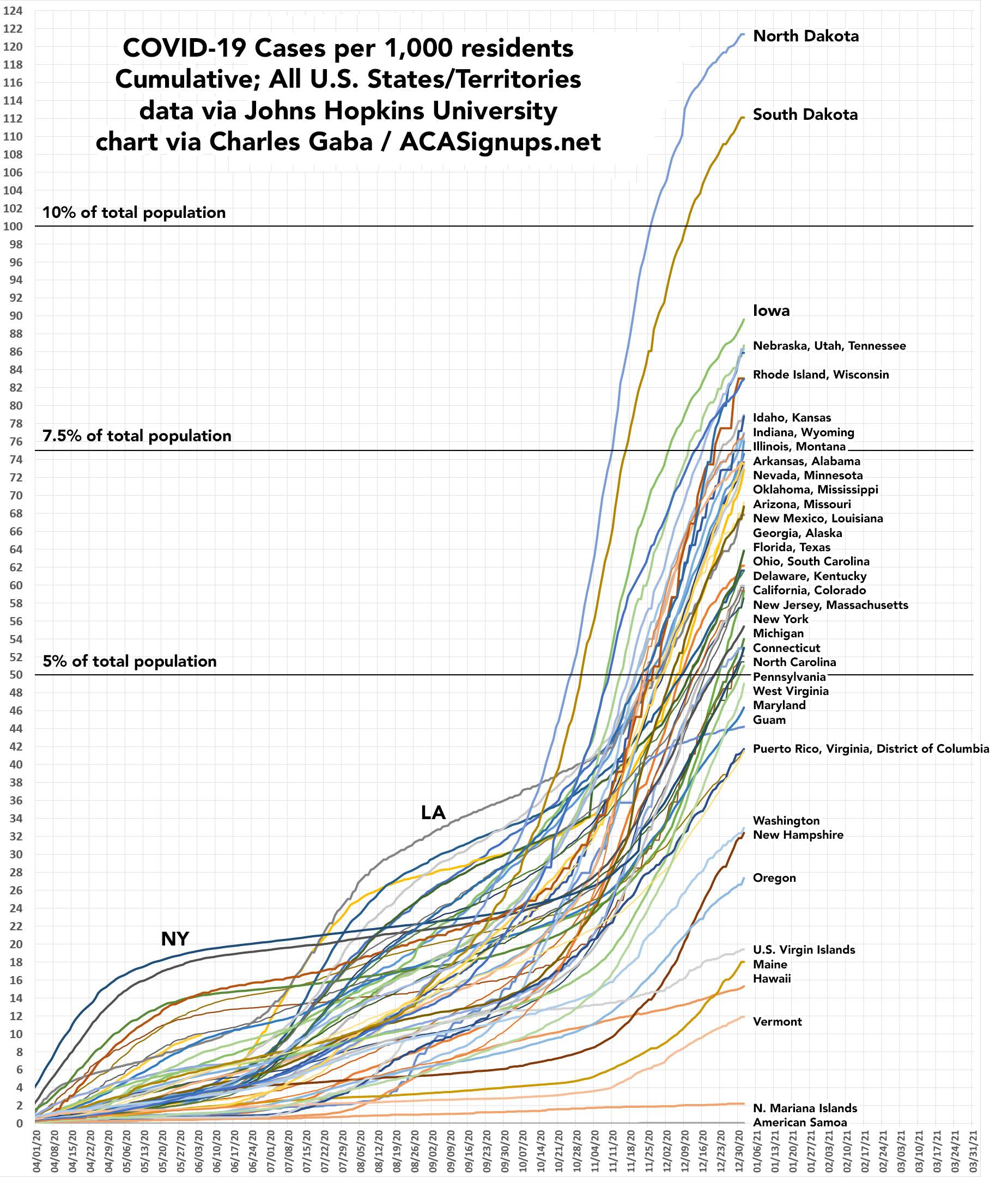 North Dakota has broken 12% of the entire population having tested positive. South Dakota is up to 11%. A half-dozen other states are hovering between 8-9% of the population being infected.
