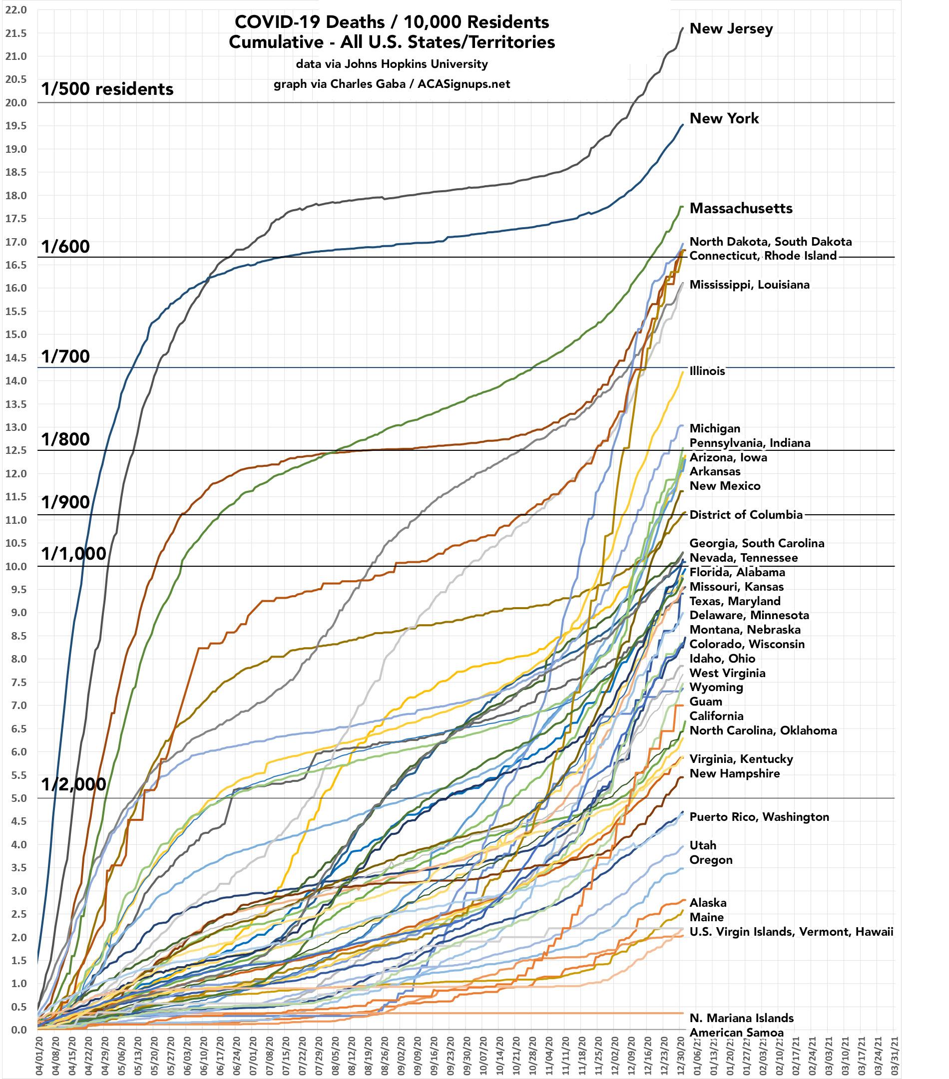I've done my best to label every state/territory, which obviously isn't easy to do for most of them given how tangled it gets in the middle. For cases per capita, the most obvious point is that New York and New Jersey, which towered over every other state last spring, are now utterly dwarfed by North & South Dakota, although their surge seems to be finally dropping (although "dropping" is a relative term...it's still pretty awful everywhere).
