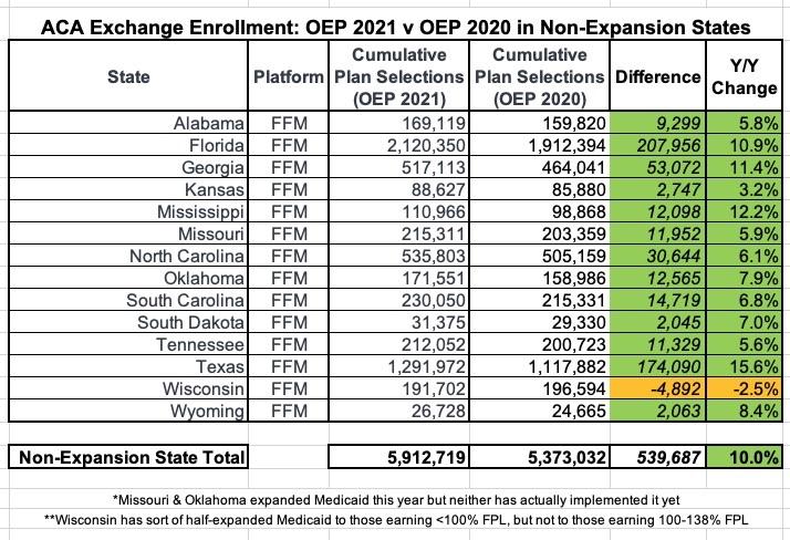 If you only include the states which have reported their final 2021 OEP data, they're running 0.5% behind last year. Again, Medicaid expansion and the disenrollment freeze almost certainly accounts for most of this...but notice that the only other state close to Massachusetts is Idaho. After that, the next-highest drops are Kentucky at 6.9% and Louisiana at 5.7%.