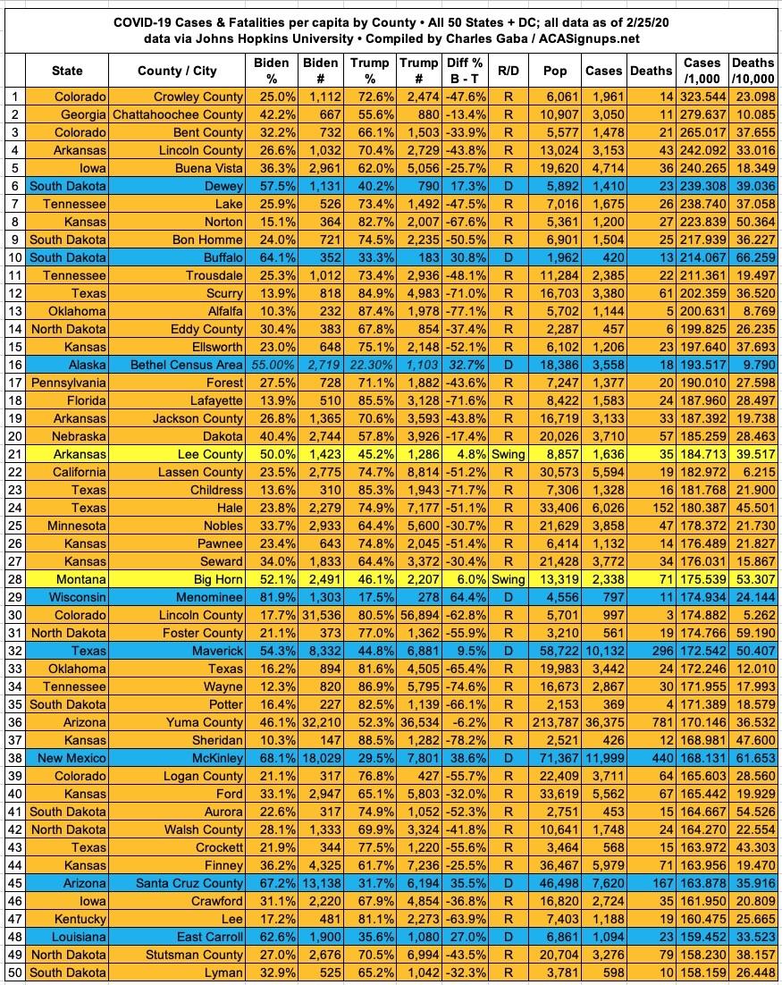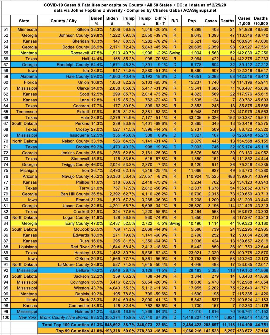 Here's the top 100 counties ranked by per capita COVID-19 fatalities as of Thursday, February 25th, 2021 (click image for high-res version):