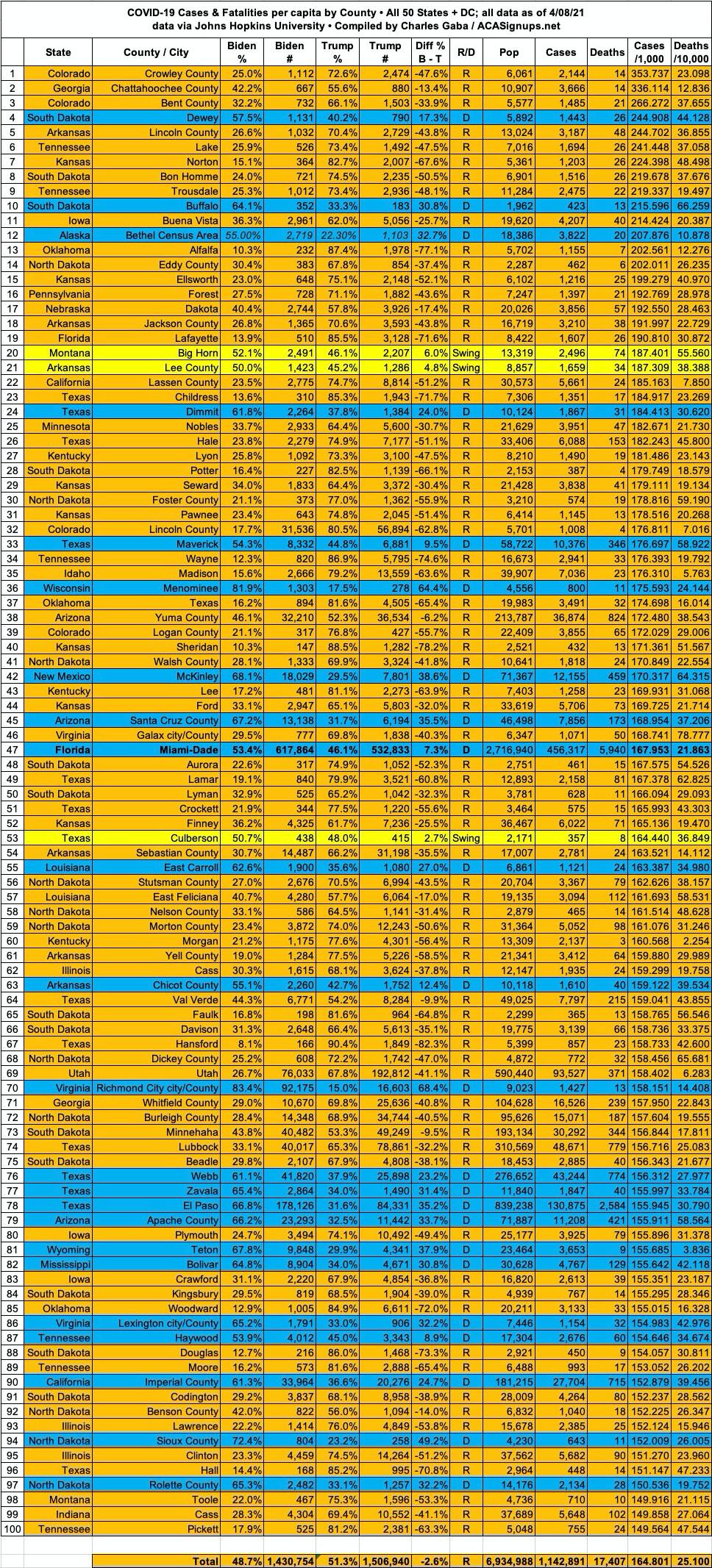 Here's the top 100 counties ranked by per capita COVID-19 fatalities as of Thursday, April 8th, 2021 (click image for high-res version):