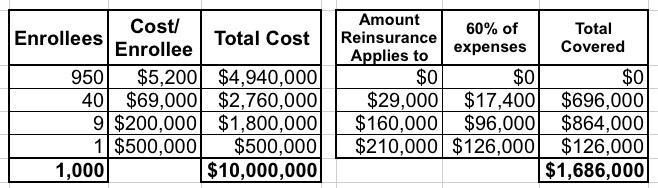 • Add it up and the reinsurance program would cover $1,686,000 out of the $10,000,000 grand total...or around 17% of all medical expenses for the entire pool.