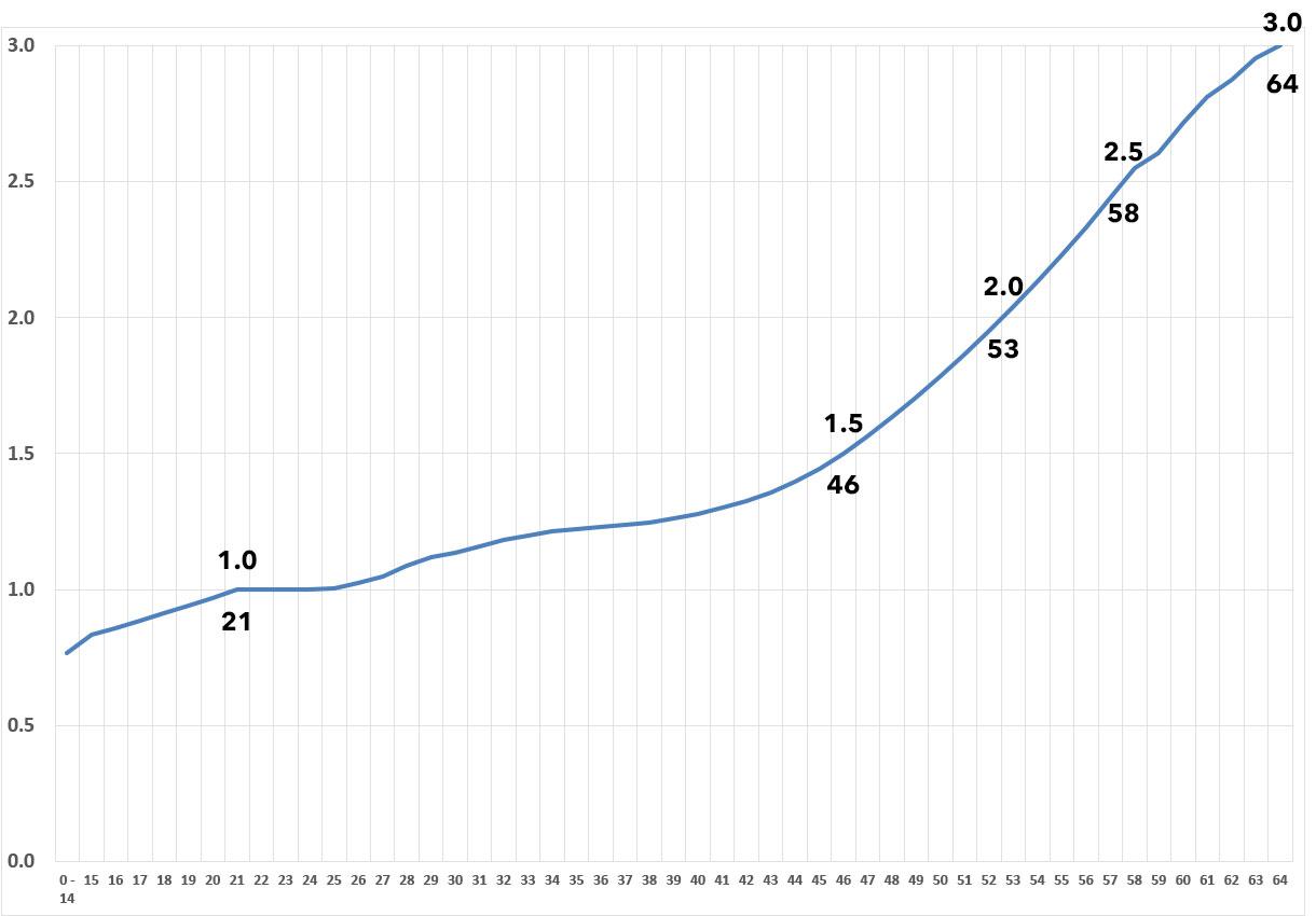 The essence of the problem remains the fact that there's a 3:1 pricing ratio limit between 64-yr olds and 21-yr olds even though the actuarial cost difference between the the two tends to be more like 5 or 6 to 1. Making this even more confusing is the fact that even that 3:1 age band isn't a straight line; that is, it doesn't hit 1.5x at 32 years old, 2.0x at 42, 2.5x at 53 and 3.0x at 64. The actual band looks more like this: