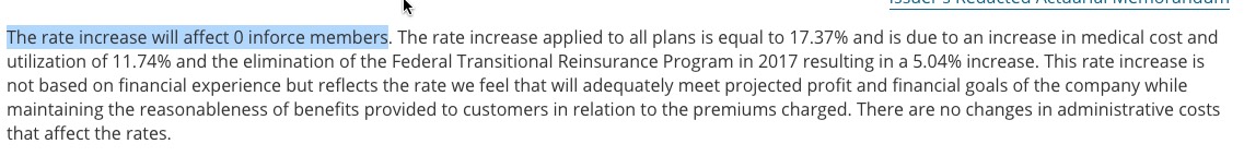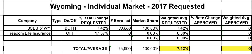 That left Blue Cross Blue Shield of Wyoming as the sole carrier providing individual policies in the states other than Freedom Life Insurance, which only sells off-exchange policies and (from their filing for 2017 below) doesn't appear to have anyone enrolled in them at the moment anyway. You would think that this would mean BCBS would take advantage of their monopoly to jack up prices dramatically...but it appears that a combination of the ACA's 80/20 Medical Loss Ratio rule, along with state insurance regulators who are presumably taking their jobs seriously, have resulted in a surprisingly low (for this year) requested rate increase: