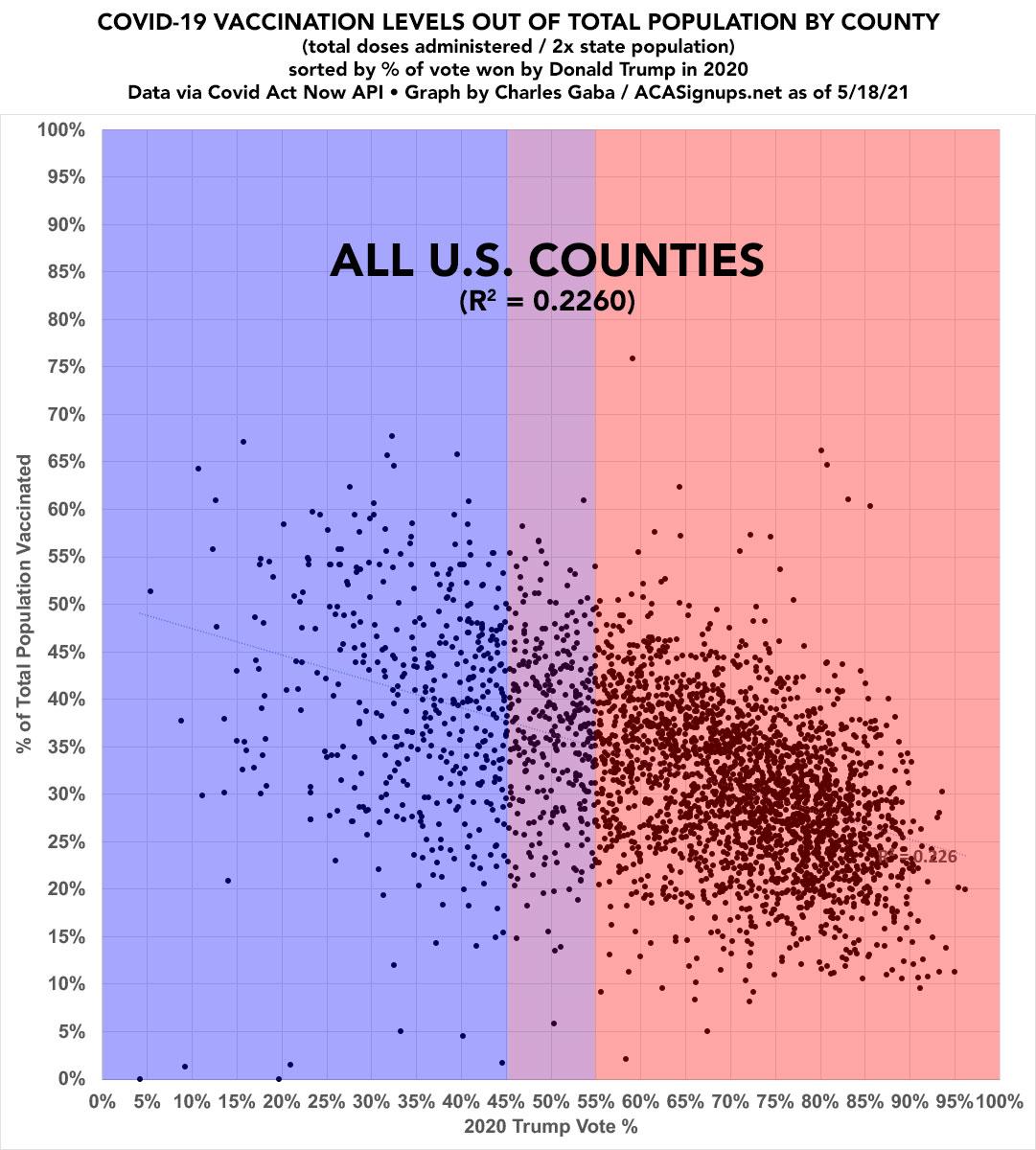 Otherwise, assuming there aren't any significant errors, here's what it looks like: COVID-19 Vaccination levels for the entire population in 3,140 counties nationwide, sorted out by Trump's % of the 2020 Presidential election vote. Behold!