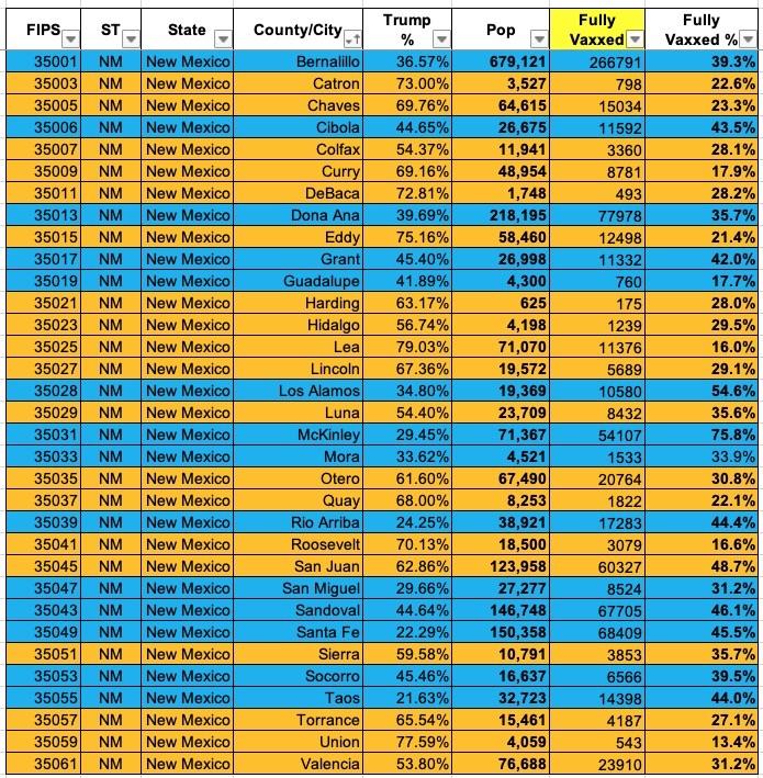 WARNING: The CDC lists ~199,000 New Mexico residents (a whopping 25% of the total fully vaccinated) whose county of residence is unknown. This could easily skew the actual results below one way or the other.