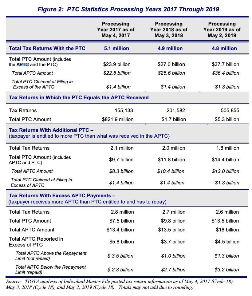 Anyway, according to the 2019 report, there were 2.8 million tax returns with excessive APTC payments in 2017, 2.7 million in 2018 and 2.6 million in 2019, with excessive APTC amounts of $5.8 billion, $3.7 billion and $4.5 billion respectively: