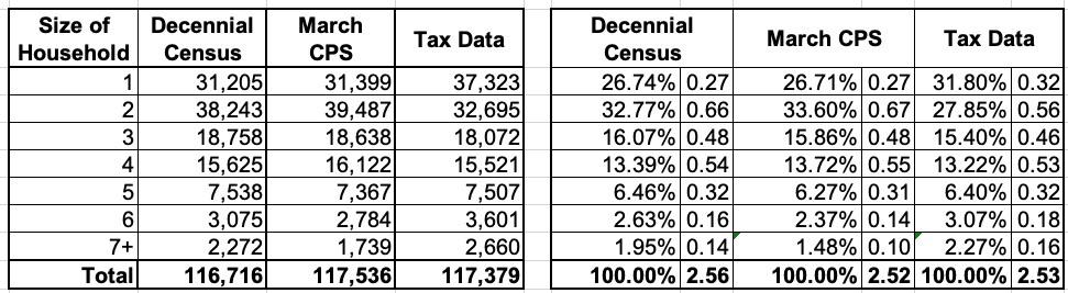 When you break all three estimates out, they come out pretty close to each other: A little over 2.5 people per household including tax filings: