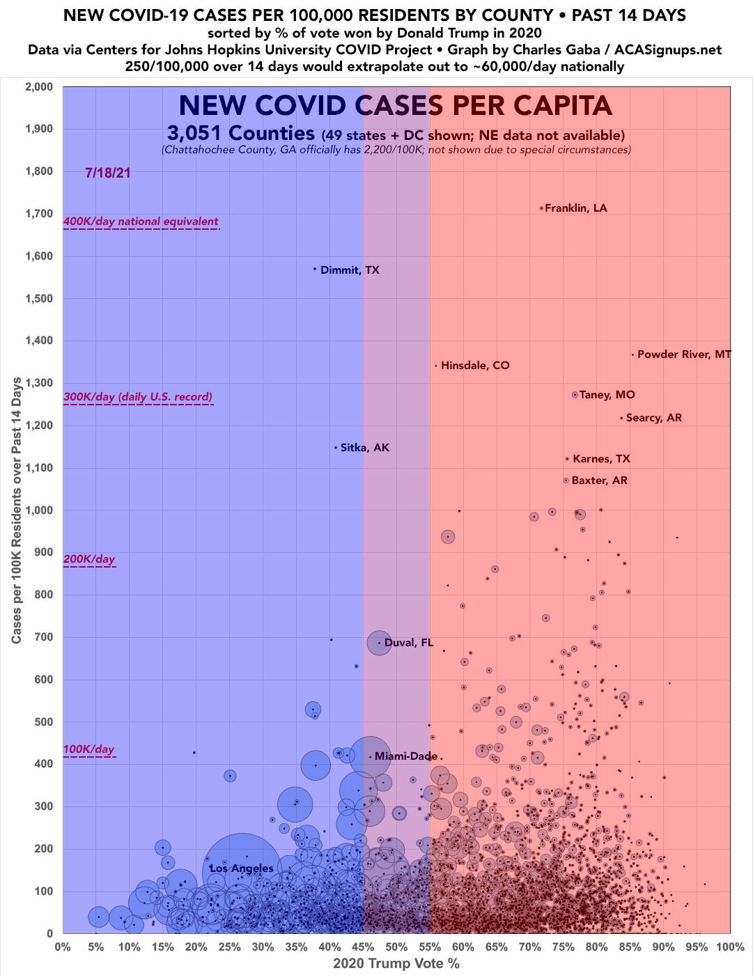 Now that it's become crystal clear that there's a massive discrepancy between the blue and red counties when it comes to COVID-19 vaccination rates, combined with the fact that the much more dangerous Delta variant has now become the dominant version of COVID spreading across the U.S., I decided it was time to revisit the county-level case data to see if that huge Blue/Red vaccination divide is showing up in newer cases.