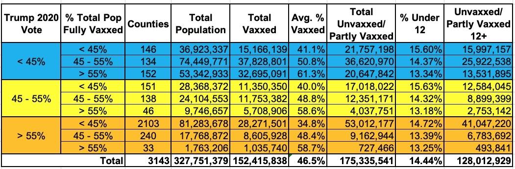 The lower right quadrant (deep red / low-vaxx, or deep MAGA country if you will) has roughly 41 million unvaccinated residents over 11 years old who could get vaccinated, or 2.5x as many as the other two quadrants above combined. The question here is how many of these folks will continue to refuse to #GetVaxxed no matter how many resources are thrown at them. Some are gettable, of course...but far too many don't appear to be.