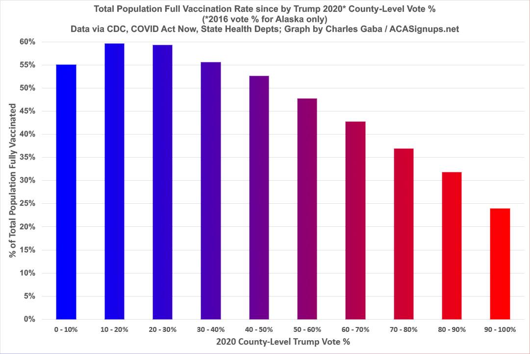 I've also looked at vaccination rates by other criteria, of course: Population density, urban vs. rural status, education level and median household income levels...but none of these have had nearly as high a correlation as sheer partisan lean has (although I haven't checked any of those in over a month; perhaps the situation has changed by now).