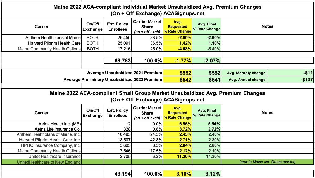 Maine: Final avg. 2022 #ACA rate changes: -2.1% individual market; +3.1% sm. group market; "Clear Choice" plans available this fall