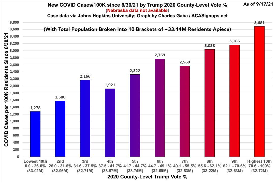 The case rate since 6/30/21 in the reddest counties is 3.6x higher than in the bluest counties, but given the tiny number of residents of those counties, it's more representative to compare the 8th & 2nd brackets, where the recent case rate is 2.9x higher.