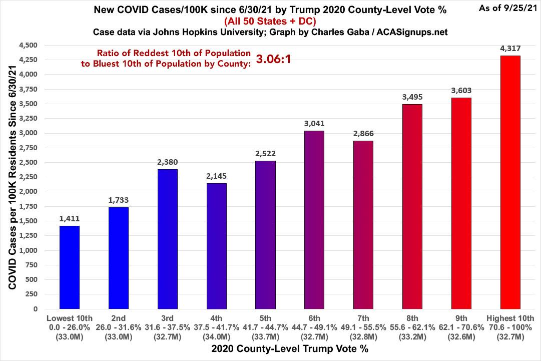 The case rate since 6/30/21 is 3.1x higher in the reddest counties (Trump >70%) than in the bluest counties (Trump < 26%).
