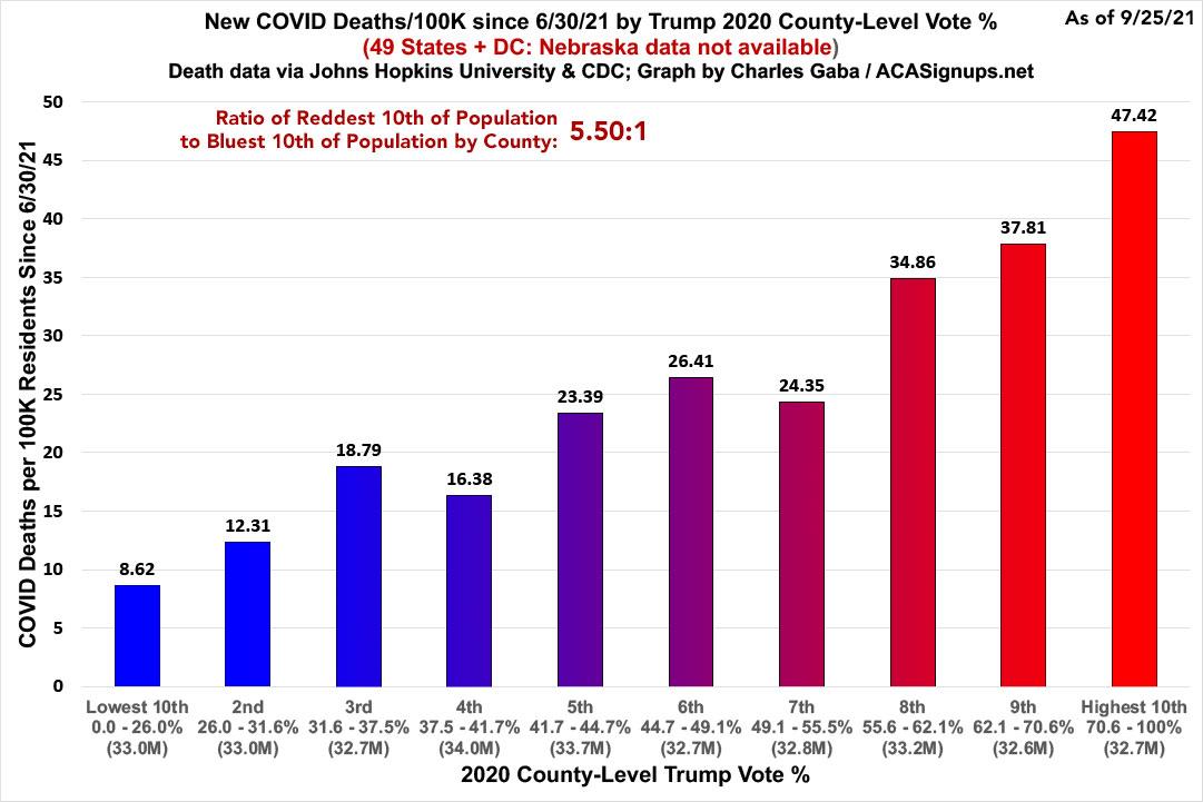 The death rate in the reddest counties are around 5.5 higher than in the bluest counties since June 30th.