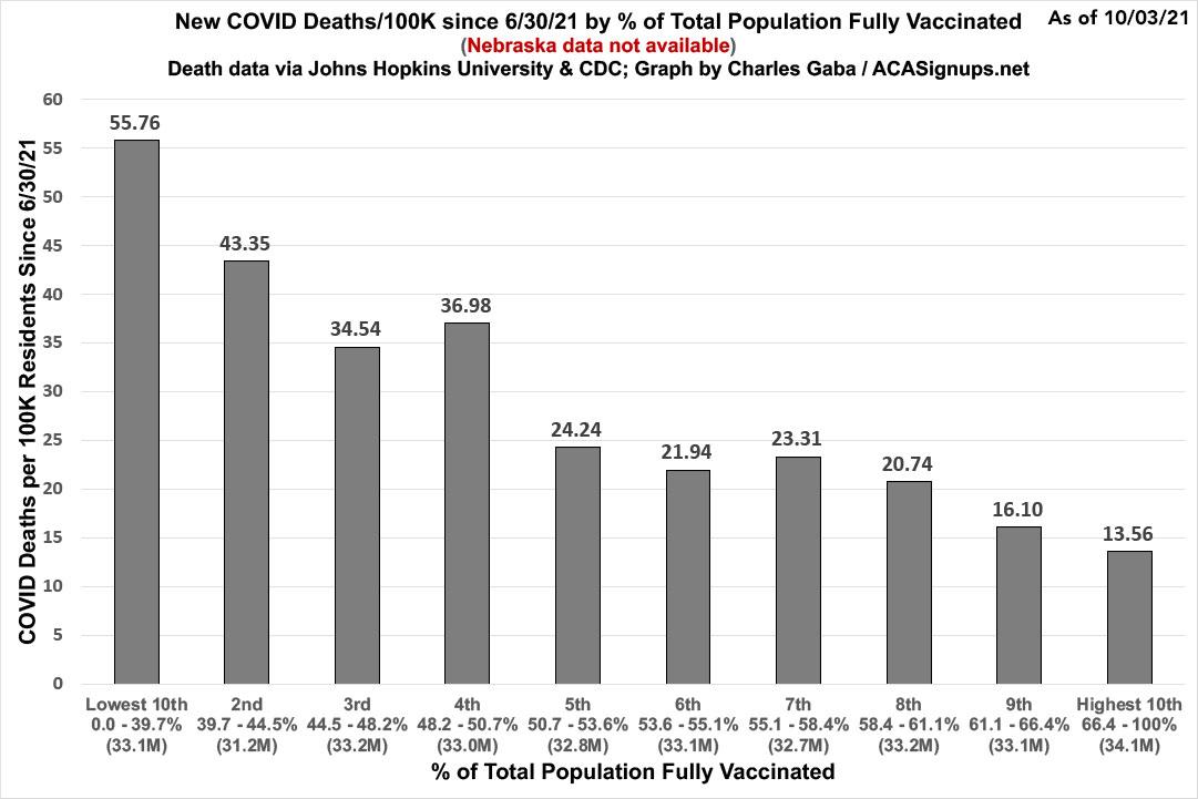 Here the difference is even more stark: COVID deaths since June in the most-vaccinated counties in America have been running less than one fourth the rate of the least-vaccinated counties.