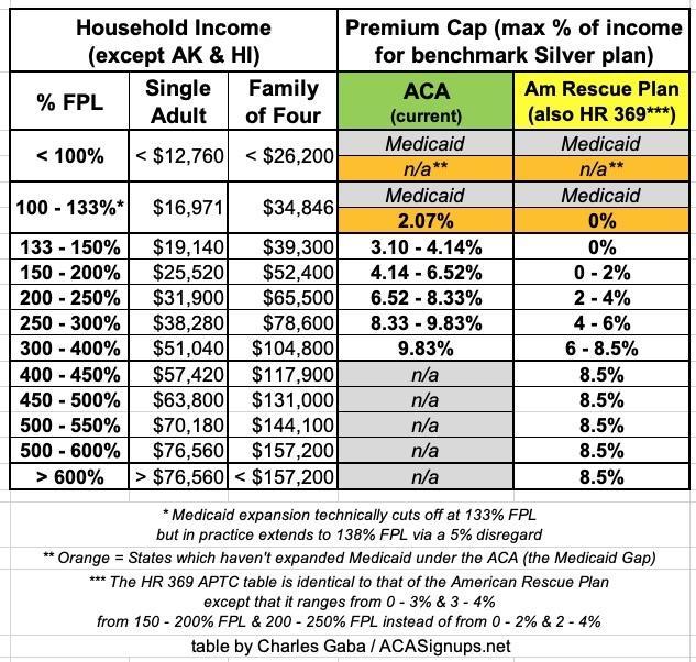 Prior to the ARP, a single adult who earns $19,000/year would have to pay around $65/month in premiums; under the ARP, they pay nothing in premiums and only a nominal amount in deductibles/co-pays. A family of four earning $78,000/year would have to pay up to $630/month; under the ARP, they pay around $380. And an older couple earning just over $70,000/year (just over the 400% FPL threshold) might have to pay as much as a jaw-dropping $1,900/month...versus no more than $495/month under the ARP.